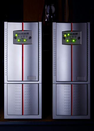 Nothing is running off of public utility power — not even the digital audio workstations. Instead, the public utility power is used to charge batteries. This battery power is fed to a pair of very high grade of inverters which together produce 5000 watts of exactly 120 volt pure 60 Hz sine wave power — enough to power the entire lab with complete ease.